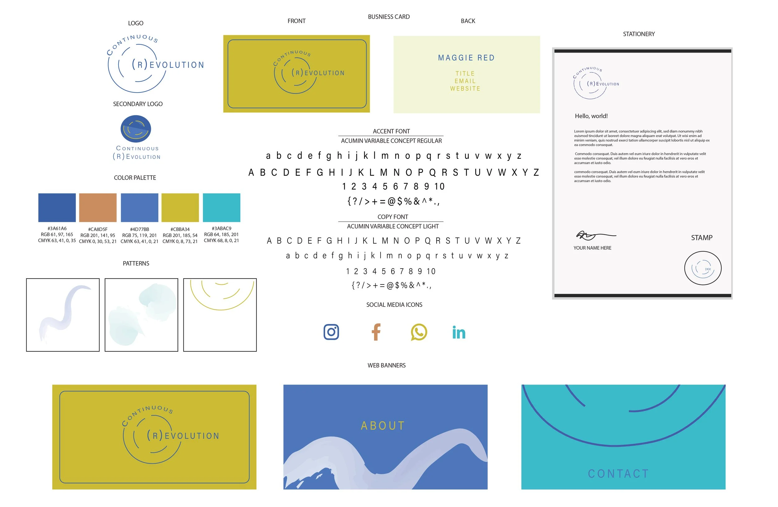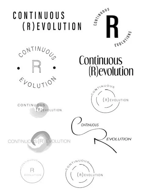 I typically work in three stages when creating a brand concept for a client, where we will first discuss their wants and needs, then enter an extensive drafting process. Then once I have what I need to produce their full concept, we begin flushing out ideas in color and physical design. Below, have a glimpse into the process whilst working with Continous (R)Evolution.